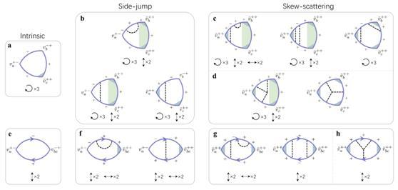 第一篇题目为“Quantum theory of the nonlinear Hall effect”(非线性霍尔效应的量子理论)发表于Nature Communications。该研究详细阐述了研究团队在非线性霍尔效应的理论研究领域取得的重要进展。非线性霍尔效应是一类新的霍尔效应,可以在时间反演对称的体系中存在并且对空间对称性十分敏感,因此可以被用于探测与体系的空间对称性破缺相关的相变行为,如铁电、向列相变等。此外,非线性霍尔效应测量十分方便。只要对现有的输运测量方式稍作倍频调整,就可以探索一大类二维和三维的拓扑和功能材料,因此将会是一个非常重要以及活跃的方向。现有的理解非线性霍尔效应的理论工作基本都是基于现有半经典理论的基础上通过将体系的输运方程展开到电场高阶来实现对非线性霍尔效应的描述。然而,各种实验事实表明非线性霍尔效应本质上是一种量子效应,其主要机制无法被半经典理论完全刻画。基于费曼图形技术,研究团队构建了首个非线性霍尔效应的量子理论,揭示了非线性霍尔效应的量子本质以及目前半经典理论存在的不足,为未来的实验以及理论工作提供了坚实的基础。