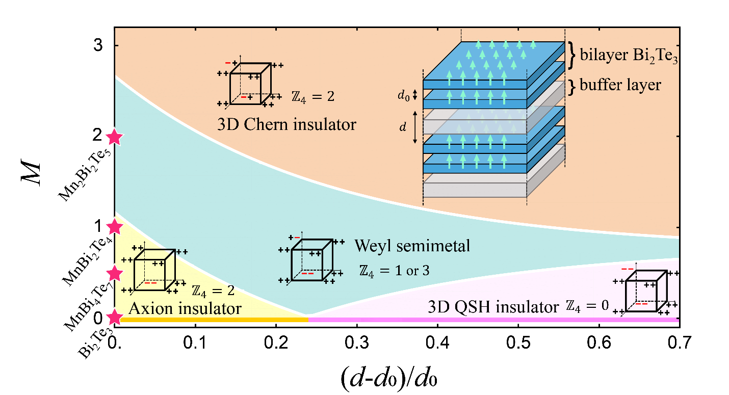 具有内禀磁化强度的拓扑材料MnBi2Te4/(Bi2Te3)n的兴起为研究具有时间反演对称性破缺的轴子绝缘体提供了一个绝佳的平台。刘奇航课题组之前的理论研究表明,通过材料设计的手段改变材料中MnBi2Te4和Bi2Te3层的比例及其堆垛情况,可以实现多种二维拓扑相,包括时间反演对称的量子自旋霍尔效应、时间反演破缺的量子自旋霍尔效应以及量子反常霍尔效应【PRL 123, 096401 (2019)】。而在本研究中,课题组进一步探讨了不同三维拓扑相的出现与材料中电子跃迁和交换相互作用强度的关系。在建立了有效模型哈密顿量后,可以通过调节模型中的参数调控诸如轴子绝缘体、外尔半金属、三维陈绝缘体、三维量子自旋霍尔绝缘体(脆拓扑)等拓扑物相,如下图所示: