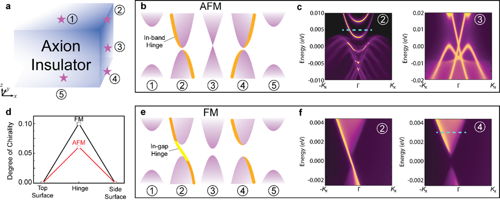 可以看出铁磁与反铁磁状态下的边缘态有明显的区别:铁磁相下,在边缘处有一连接导带和价带的无能隙态(in-gap hinge state),而反铁磁的轴子绝缘体并不存在带隙内的边缘态,但是存在镶嵌在导带和价带中具有手性的带内边缘态(in-band hinge state),这可以被看做轴子拓扑态的边缘态谱学特征,为后续的实验测量提供了理论支持。