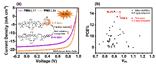 全聚合物太阳能电池(all-polymer solar cells)是用高分子半导体材料同时作为电子给体和电子受体共混制备的有机太阳能电池。相比其它类型有机太阳能电池,全聚合物太阳能电池具有更为优异的光热稳定性和机械性能,从而更具实用价值。发表在《先进材料》上的论文报道了利用课题组自主研发的双锡化双噻吩酰亚胺(BTI)与双溴化稠环电子受体聚合,制备了具有受体-受体型骨架的窄带隙n型高分子受体材料L14(图1)。L14有效地结合了稠环电子受体小分子和受体-受体型高分子半导体的优势,在长波长区域(700-900 nm)具有高吸光系数且前线分子轨道能级相对于给体-受体型高分子受体材料L11(图1)明显降低,从而使得L14的电子传输能力得到显著提升。令人惊喜的是,双噻吩酰亚胺的引入使得基于L14的全聚合物太阳能电池器件的发光量子效率取得了极大提高,非辐射能量损失仅为0.22 eV。因此,尽管L14与高分子给体PM6间能极差相对L11与PM6增大,但太阳能电池的开路电压(VOC)并没有更大的损失。基于L14的全聚合物太阳能电池获得了14.3%的能量转换效率,是该类电池的最高值之一。课题组研究助理教授孙会靓为该论文第一作者,郭旭岗为通讯作者。
