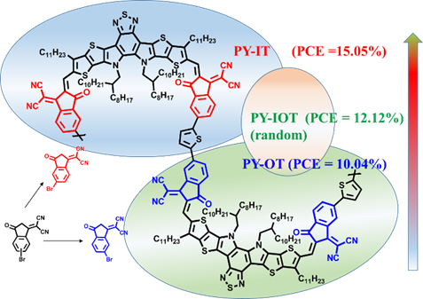 目前,基于稠环电子受体小分子的高分子受体材料已将全聚合物太阳能电池的能量转换效率提升至13%以上。但是,由于溴化端基的异构,稠环电子受体小分子单体通常由三种异构体的混合物组成。在最新的工作中,课题组成功分离了两个异构端基,解决了区域异构问题。以此为基础,合成了三个聚合物受体材料PY-IT,PY-OT和PY-IOT(图2),其中PY-IT和PY-OT是结构规整的受体-给体型共聚物,PY-IOT为三元无规共聚物,两种受体单体比例为1:1。紫外吸收光谱测试表明从PY-OT,PY-IOT到PY-IT,吸收边界逐渐红移,从而有利于对太阳光的吸收。理论计算表明,相对于PY-OT和PY-IOT,PY-IT的最低未占有分子轨道(LUMO)能够离域在整个分子骨架上,从而有效地增强了受体材料的电子传输能力。以PY-IT为电子传输材料的全聚合物太阳能电池实现了15.05%的能量转换效率,远高于PY-OT(10.04%)和PY-IOT(12.12%)的电池性能,15.05%的效率也是迄今为止全聚合物电池的最高值。这项工作表明,稠环电子受体单体上的聚合位点将对器件性能产生显著影响,为发展高性能高分子受体材料奠定了重要实验和理论基础。相关研究成果在《先进材料》上发表。课题组研究助理教授孙会靓为该论文的通讯作者。