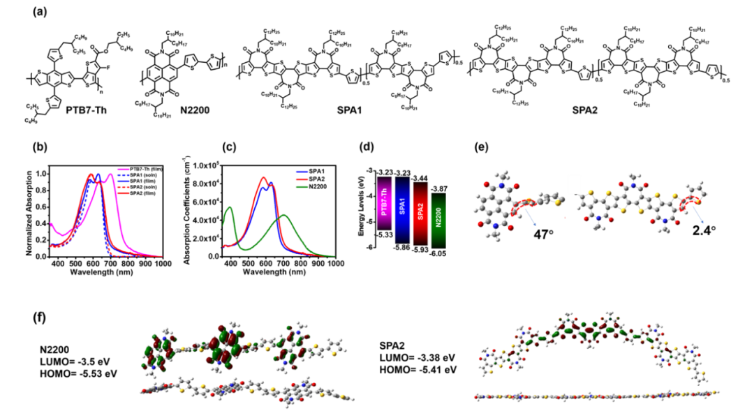 课题组通过对比基于新型双噻吩酰亚胺衍生物(BTIn)的高分子受体材料和经典高分子受体材料N2200,系统深入地研究了高分子受体材料LUMO能级变化对于全聚合物太阳能电池能量损失及器件性能的影响,开发了具有高开路电压和超低非辐射损失的全聚合物太阳能电池。利用缺电子单元BTIn结合侧链工程和随机共聚的分子设计策略,合成了两个新型BTIn高分子受体SPA1和SPA2,与经典萘二酰亚胺高分子受体相比,BTIn高分子具有可调的LUMO能级(图3)。因此可以通过提升LUMO能级减小高分子给体和高分子受体材料间LUMO的差异,从而提升开路电压值。电致发光和高灵敏外量子效率测试结果表明,与N2200纯膜及其混合膜C相比,SPA1纯膜与相应共混膜A具有相同发射峰且未观察到明显的电荷转移态峰,使得基于SPA1的全聚合物太阳能电池获得了1.15 V的开路电压。通过进一步调节LUMO能级,基于SPA2(混合膜B)的全聚合物太阳能电池可以同时获得高开路电压指(1.02 V)和外量子效率光响应(最大值大于> 70%)。在该体系中,尽管电荷解离驱动力趋近于0,但仍可发生超快电荷转移,并发现基于SPA1和SPA2的全聚合物太阳能电池都具有高的发光量子效率(0.8×10-3和0.1×10-4),远高于基于N2200的全聚合物太阳能电池(0.4×10-7),使得电池的非辐射复合损失分别低至0.16 eV和0.29 eV。最终在未使用任何添加剂的条件下,全聚合物太阳能电池的能量转换效率分别为4.46%和9.21%。其中4.46%的效率是有机太阳能电池中非辐射损失低至0.16 eV时的最高值,9.21%的效率是所报道基于非小分子受体高分子的全聚合物太阳能电池的最高值之一。相关研究成果在《中国科学:化学》上发表。课题组研究助理教授孙会靓和南科大-北大联合培养博士生刘斌为该论文共同第一作者,郭旭岗为通讯作者。