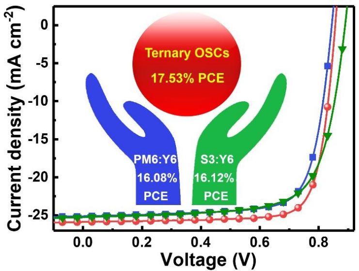 三元策略在提高有机太阳能电池性能方面具有多方面的优势,从而引起了研究人员的兴趣。值得注意的是,在主二元体系中加入第三组份将导致活性层更为复杂的混合形貌。材料兼容度不好会导致严重的分子无序和大尺度的相分离,从而降低太阳能电池的性能。相对于两种小分子,两种高分子的兼容性通常较差,这是基于两种高分子给体的三元电池相对于基于两种小分子受体的三元电池成功几率较低的主要原因。郭旭岗课题组发表在《能源与环境科学》上的论文介绍了一种高效的高分子给体材料S3的合成,并将其加入到经典的PM6:Y6二元体系中制备了三元有机太阳能电池。S3与PM6具有互补的吸收光谱和良好的兼容性,有利于对三元共混膜的光子捕获和形貌进行优化,从而同时提高短路电流密度(JSC)以及填充因子(FF)。同时,S3的最高占有分子轨道(HOMO)能级略低于PM6,这使得三元有机太阳能电池的非辐射能量损失比基于PM6的二元太阳能电池更低,从而取得更高的开路电压。优化后的三元电池的能量转化效率高达17.53%(图4),是报道的三元有机太阳能电池中最高值之一。该研究进一步证明三元策略是提高有机太阳能电池性能的普适性方法,为实现高效、低成本的有机太阳能电池提供了有效途径。郭旭岗课题组本科生王俊玮(现为南科大2020级硕士研究生)为该论文共同第一作者,孙会靓为该论文的通讯作者。