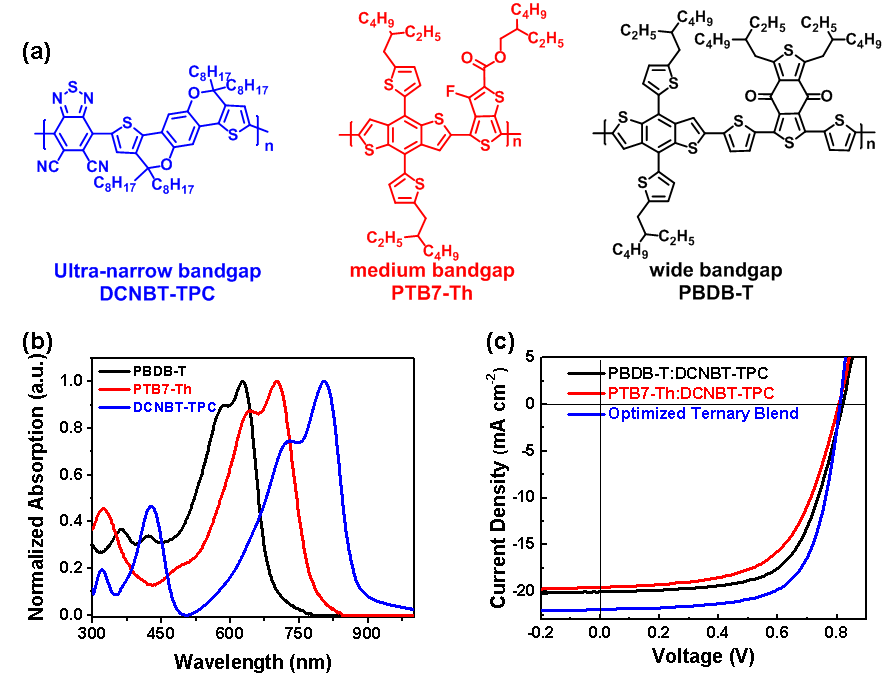 构筑三元有机太阳能电池是提升电池效率的有效策略。然而,该策略在全聚合物太阳能电池中的应用十分有限,这是因为缺乏高效率的窄带隙高分子受体材料和多元高分子共混造成的形貌难以控制的挑战。课题组前期在《先进材料》中首次报道了具有超窄带隙(1.38 eV)的高分子半导体材料DCNBT-TPC,该半导体在长波区域具有很强的吸收,打破了长期以来限制高分子受体材料在二元全聚合物电池中性能的瓶颈。在此基础上,课题组发表在《先进功能材料》上的论文将该高分子半导体与宽带隙的PBDB-T和中等带隙的PTB7-Th共混制备的三元全聚合物电池获得了21.9 mA cm−2的短路电流密度和12.1%的能量转换效率(图5),打破了现有三元全聚合物太阳能电池的效率记录。这表明利用超窄带隙的高分子受体材料与相容的高分子给体材料共混制备三元全聚合物太阳能电池是推进全聚合物太阳能电池发展的强有力手段。课题组博士后冯奎为该论文第一作者,郭旭岗为通讯作者。