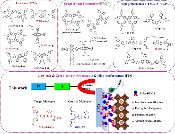 近年来,在钙钛矿太阳能电池研究领域,电荷传输材料的设计与界面的研究越来越受到研究者的关注,因为其对钙钛矿太阳能电池的能量转化效率及器件性能的稳定性都起着至关重要的作用。例如,对于空穴传输材料的研究一直颇受材料学家的重视,为了加快钙钛矿太阳能电池的产业化进程,空穴传输材料应同时满足以下三个需求:高性能(包括高光电转换效率与高稳定性)、低成本、绿色环保溶剂加工。虽然最近一些高效的空穴传输材料被开发出来,但能同时满足以上三个要求的材料鲜有报道。郭旭岗课题组通过在一种简单的给体-受体型分子骨架上引入2-氰基丙烯酸基团,设计合成了低成本,可醇溶剂加工的小分子空穴传输材料(MPA-BT-CA),用于倒置钙钛矿太阳能电池可获得高达21.24%的能量转换效率与不错的器件性能稳定性。采用乙醇作为加工溶剂,器件效率仍可达到20.5%(图6)。相关研究成果在《美国化学会志》封面发表,并被选为亮点(Spotlights on Recent JACS Publications)进行报道(https://pubs.acs.org/doi/pdf/10.1021/jacs.0c10589)。课题组高级研究学者王漾和2018级南科大-哈工大联合培养博士生廖巧干为该论文共同第一作者,郭旭岗为通讯作者。