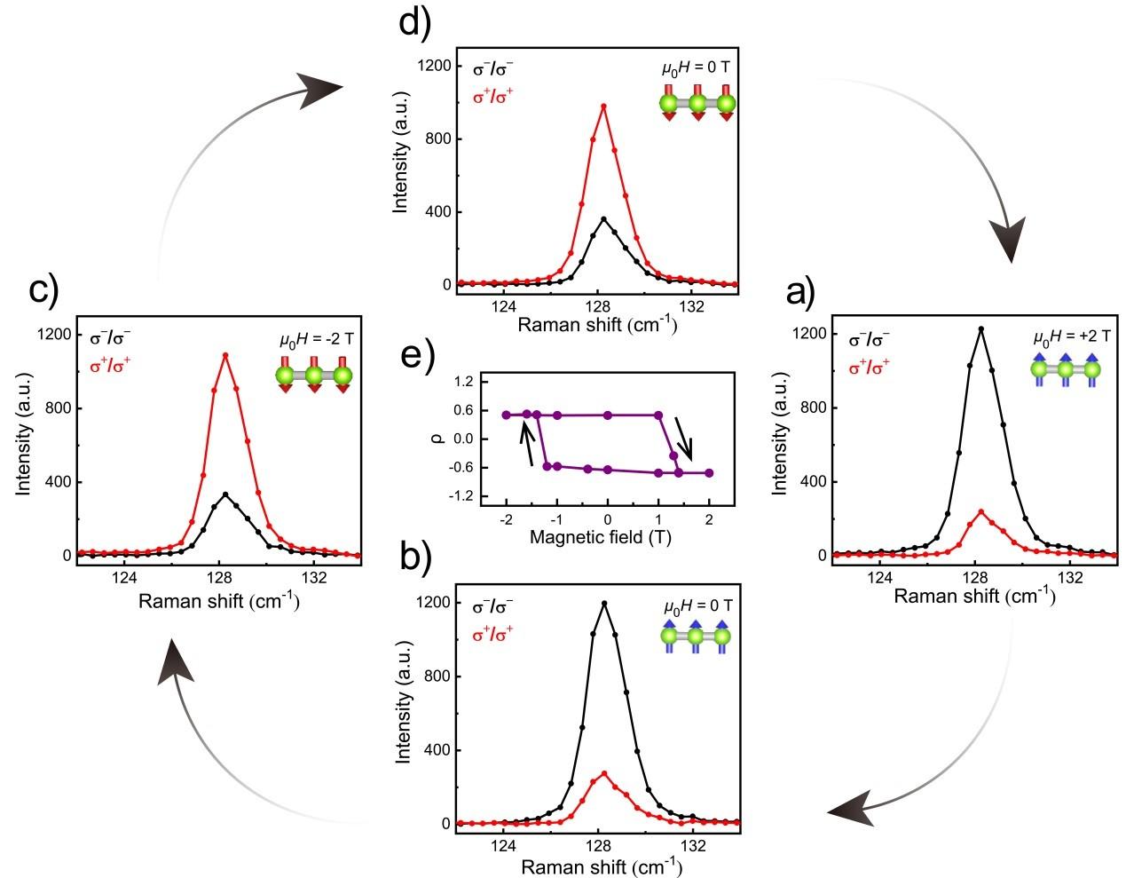 本研究中,合作团队系统研究了二维铁磁材料VI3的拉曼光谱对温度与磁场的响应,实验结果成功探测到VI3的结构相变、磁相变和磁振子激发。本研究首次采用了旋光偏振拉曼的手段来研究其磁光拉曼效应。研究发现,当VI3进入铁磁态后,其光学声子对左/右旋光的拉曼散射强度差别很大(如图1a所示);而这一差别会在VI3进入顺磁态后消失。材料光学声子对左/右旋光的散射强度的差别直接反映了材料中时间反演对称性的破缺。如图1所示,当VI3中自旋朝上时,其左旋光的散射强度远大于右旋光的散射强度;通过外加磁场将其自旋方向翻转后,其散射强度也会随之发生反转。如图1e所示,随着测量拉曼圆偏振度随磁场的变化,能清楚地观测到铁磁材料特有的磁滞回路。这项研究首次成功通过声子的拉曼光谱对材料的铁磁性进行直接探测,证明了旋光偏振拉曼光谱可作为一种研究铁磁性的微区探测工具,可直接应用于其他二维磁性材料的研究。课题组还通过第一性原理计算和磁点群分析,对以上实验现象进行了完美的理论解释,进一步揭示了磁光拉曼效应的物理本质。
