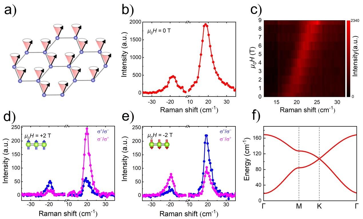 在磁性材料中,其自旋有序态的动力学特性可以用自旋波来描述,而自旋波的频率直接决定了自旋器件的极限开关速度。磁长程序在二维极限下的稳定存在,来源于材料中磁各向异性导致的自旋波带隙(即声学支磁振子)。在处于顺磁态的VI3的拉曼光谱中,课题组观测到来源于自旋涨落的准弹性散射信号;该信号会随着温度降低逐渐演化为声学支磁振子的拉曼模式(如图2b所示),该模式来源于VI3中自旋的同相位进动(如图2a所示)。图2c中能清楚地观测到外加磁场中磁振子的塞曼能量位移。通过结合第一性原理和线性自旋波理论计算,VI3的磁各项异性能被确定为1.16 meV。大的磁各向异性预示着铁磁序在二维极限下的稳定性很好,并具有较高的矫顽场,这对VI3在未来自旋器件中的应用至关重要。