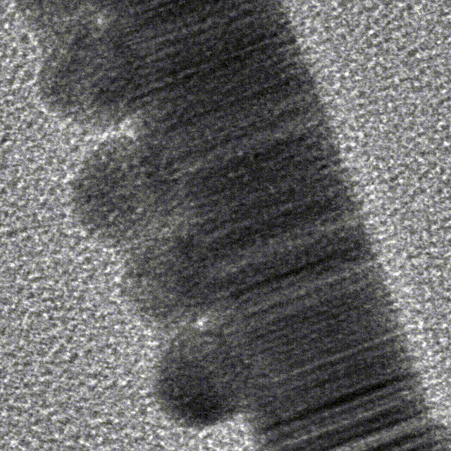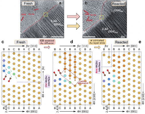 纳米催化剂被广泛应用于各种催化体系,诸如像产氢,双氧水选择性还原,气体催化以及二氧化碳还原等等。鉴于对纳米催化剂进行原子分辨的原位表征十分困难,目前人们对催化剂在化学反应中的实际形态和活性位点的认识仍然十分有限。 纯贵金属纳米催化剂设计的核心在于晶体控制和表面控制。目前比较常见的Au纳米结构,多为立方相(fcc);相对而言,具有ABAB的4H晶相的Au比较少见。在此工作中,作者通过设计4H晶相的Au纳米棒,利用环境透射电镜(ETEM)在气体实验中原位观察到Au纳米颗粒通过外延生长的方式,可以实现fcc到4H晶相的转变。 动画1. 原位TEM观察CO气氛下金的fcc晶相向4H晶相的动态转变 本研究采用了原位透射电镜(in situ TEM)来表征相转化过程,因其可在原子尺度下直接观察样品在外界作用下(力、热、电、磁等)或化学反应过程中的微结构变化。动画1展示了fcc晶相向4H晶相的动态转变过程:首先fcc-Au纳米粒子中的金原子被高能电子束激活,在CO气体中扩散到界面区域,金原子扩散导致金颗粒烧结形成紧密接触的界面,然后从两相界面开始发生fcc-4H相变。此外,我们发现当fcc金纳米颗粒位于纳米棒的4H和fcc交界处时,位于4H区域的金转变为4H相,而在fcc区域上的金仍保持fcc晶相。因此,相变过程与外延生长机制密切相关,这两相间界面能的降低提供了驱动力。对照实验表明,室温中在同样的电子计量下,在真空和氩气中没有反应发生。因此,CO与金原子键合可以有效的促进金扩散和fcc晶格的重新排列,从而在新形成的4H相中形成有序的层错堆叠。 在本文中,通过密度泛函理论(DFT)计算和分子动力学模拟(AIMD)可以发现,CO分子的加入使得4H-fcc界面上产生动态金单原子,其与CO分子结合,形成可以迁移的Au-CO物种。这种动态迁移的物种会削弱金单原子与其他金原子的相互作用,导致纳米金颗粒表现出非常强的柔韧性,从而大大降低金原子在界面处迁移的能垒。此外,对于fcc纳米颗粒内部,由于金是导体,电子束照射在表面生成的或被捕获的热电子会广泛分布到金-金反键轨道上,从而大大降低表面与内部金原子层滑动的能垒。通过这些额外电子的润滑作用,内层“ABCABC……”排列的fcc相可以转化为“ABCBABCB……”排列的4H相。 图2.(a,b)反应前和反应中HRTEM图像:红色曲线表示4H与fcc两相的界面,白色直线表示图片标尺,对应数值5nm;(c,d,e)fcc-4H相转变的原子结构模型:首先是CO促进Au原子扩散迁移,然后是额外电子促进原子面滑移,最终实现纳米颗粒晶相的转变 基于以上实验与理论分析,我们可以得到4H基底上fcc纳米颗粒转化为4H相的机理(图2)。首先CO分子会与界面处的金原子形成Au-CO复合体,带动fcc纳米颗粒上的金原子向4H基底迁移,生成新的4H相并减小4H-fcc相之间的空隙。之后在额外的电子的润滑作用下,金原子层会发生滑动,消弭最后的微小空隙,从而实现原子的重新排列。如此层层推进,在CO与额外电子共同的促进作用下,fcc纳米颗粒最终完成到4H相的转变。 本研究在金纳米颗粒表面原位观察到的fcc到4H的转变,并通过理论计算得到其动态转化机理,对后续的催化剂机理与性质的研究具有重要的意义。 谷猛课题组与王阳刚课题组的博士后韩韶波、夏广杰与访问学者蔡超为本文的共同第一作者。谷猛与王阳刚为本文的共同通讯作者。清华大学化学系教授李隽全程对该工作进行了指导。 论文链接:https://www.nature.com/articles/s41467-019-14212-z