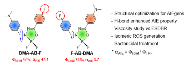 在这项研究中,课题组仅需通过氟原子的取代,就可有效利用分子内氢键作用来限制分子的运动、增加发光单元的晶体密度,从而使非辐射衰变速率降低一个数量级,开发出高固态量子产率的平面型AIEgens。同时,课题组利用该材料聚集诱导活性氧簇生成的特性,成功证明该类平面型AIEgens有用于治疗多重耐药细菌感染的潜力。