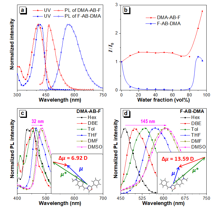 DMA-AB-F和F-AB-DMA两种平面型AIEgens的紫外-可见光和荧光光谱