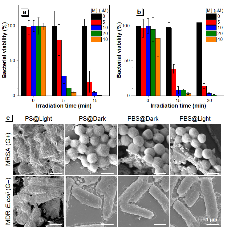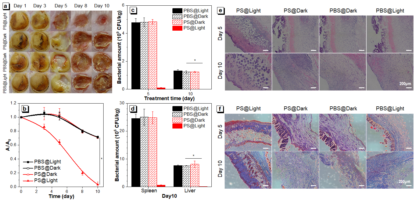 课题组进一步将该类平面AIEgens材料作为光敏剂,探索其在多重耐药菌感染的光动力治疗中的效果。在体外实验中,DMA-AB-F分子显示出对多重耐药大肠杆菌及耐甲氧西林金黄色葡萄球菌的良好杀伤效果。在体内实验中,课题组建立了标准的小鼠三级烧伤感染模型来评估材料的灭菌效果。结果显示,经过光动力治疗的伤口恢复情况显著优于对照组,光动力实验组样本的细菌数量也显著少于对照组。因此,体外和体内实验证明DMA-AB-F作为AIE光敏剂具有优异的光动力抗菌疗效。
