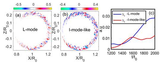 图1 (a), (b) 非线性模拟在 t = 1800t0 处扰动静电势的二维模结构。 (c) L-mode 和 I-mode-like 情形下的离子热导率。