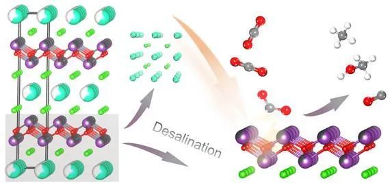 开发高效光催化剂,将大气中CO2还原为碳氢燃料,是解决自然环境中因为二氧化碳浓度升高而引起全球变暖问题的重要途径,也是保障我国“30.60计划”重大国家战略顺利实施,实现“碳达峰”、“碳中和”战略目标的关键。研究团队基于固态复杂无机化合物中碱金属盐层易水解的特性,首次提出了一种“晶格脱盐”策略,并基于该策略,采用自上而下的湿化学方法,从Pb0.6Bi1.4Cs0.6O2Cl2母体结构出发,设计制备了一种新型二维(2D)超薄双金属卤氧化物Pb0.6Bi1.4O2Cl1.4。该材料展现了优异的比表面积、丰富的双金属活性位点、以及高效的载流子动力学特征,能够在气固相界面,实现对大气浓度CO2的还原,并将其转化为碳氢燃料。这种新型“晶格脱盐”策略,为制备其他更丰富的复杂组分结构二维材料提供了新的思路。相关论文以“Unlocking Bimetallic Active Sites via a Desalination Strategy for Photocatalytic Reduction of Atmospheric Carbon Dioxide”为题,发表在国际著名期刊Nature Communications上。