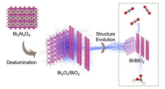 在电催化CO2资源化转化方面,研究人员以Al−O和Bi−O层交错堆叠而成的层状块体材料Bi2Al4O9为前驱体,在熔融碱的腐蚀作用下,通过进一步脱铝,构筑了一种新型Bi基纳米异质结Bi2O3/BiO2,并发现该异质结在较宽的电压范围内可高效电催化二氧化碳还原产甲酸。同时,通过耦合原位X射线衍射谱和拉曼光谱,揭示了持续电催化还原过程中,异质结电催化剂结构及其活性催化位点的动态结构演化规律,为合理设计高效电催化CO2还原异质结电催化剂,提供了新的设计思路和技术支撑。相关研究以“Bi2O3/BiO2Nanoheterojunction for Highly Efficient Electrocatalytic CO2 Reduction to Formate”为题,在国际著名期刊Nano Letters上发表。