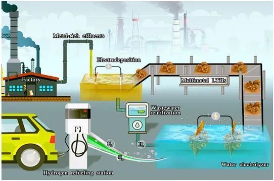 在废旧电池工业废水资源化方面,研究人员通过耦合电沉积与水裂解工艺,将该联合工艺应用于电池工业废水处理,实现了典型工业废水中金属回收和废水能源化同步利用,为工业废水的闭环综合利用,提供了一种新的思路,为未来工业废水的闭环回收和资源化能源化利用提供了参考。研究人员利用电沉积得到具有分层的纳米花结构的NiCoMn氢氧化物,其能够进一步作为双功能催化剂实现电沉积后废水的电催化裂解,其产氢性能优于贵金属Pt/C||RuO2电极对。进一步的研究表明,NiCoMn氢氧化物中价态较低的金属物种具有较高的氢析出活性,且原位演化的无定形金属(氧)氢氧化物是析氧活性位点。研究成果以“Integrating electrodeposition with electrolysis for closing loop resource utilization of battery industrial wastewater”为题,在国际著名期刊Green Chemistry上发表。