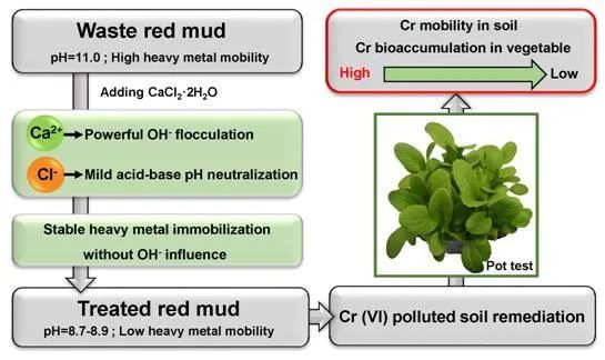 在赤泥的资源化转化及其在重金属污染土壤修复工程中的应用方面,研究人员创新性通过向废弃赤泥中引入Ca2+、Cl−阴阳离子对,大幅降低了赤泥的高碱腐蚀性和重金属溶出风险,并成功将回收稳定的废弃赤泥用于Cr(VI)污染土壤修复。经盆栽实验证实,对比未处理的污染土壤,加入稳定化处理后的废弃赤泥有效降低了污染土壤中Cr(VI)的迁移性,显著减少了油菜对土壤中Cr(VI)的吸收。该研究从我国环保技术发展的实际需求出发,提出并论证了“以废治污”的新型固废资源化及土壤修复路线,具有良好的技术应用潜力及环境生态效益。相关成果以“Dual ions neutralized and stabilized red mud for chromium (VI) polluted soil remediation”为题,在环境工程领域知名期刊ACS ES&T Engineering上发表。