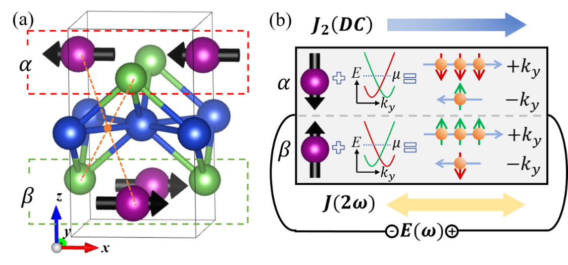 通常,人们先通过施加外电场等手段打破材料的宏观空间反演对称性,使得隐藏自旋极化在能量上分裂开来,再进一步构建自旋场效应晶体管等应用。在本研究中,刘奇航课题组创新性地提出了利用隐藏自旋极化耦合另一个空间上奇函数分布的物理性质,如反铁磁聂耳序、隐藏贝里曲率、隐藏轨道极化等等,这可以在不破坏材料宏观对称性的情况下获得宏观可测量的物理量。其中,引入反铁磁不仅能耦合出实空间上偶对称分布的物理量,还因为磁性的介入(时间反演破缺)而打破动量空间的奇对称分布。据此,研究团队预言了由隐藏自旋极化引起的反铁磁材料中非互易非线性电流输运现象。