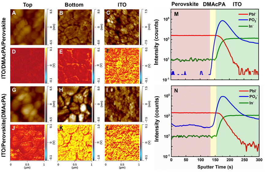 图2. 基于红外原子力显微(A-L)和二次离子质谱技术(M-N)测试,吖啶分子(DMAcPA)在钙钛矿薄膜中的分布状态