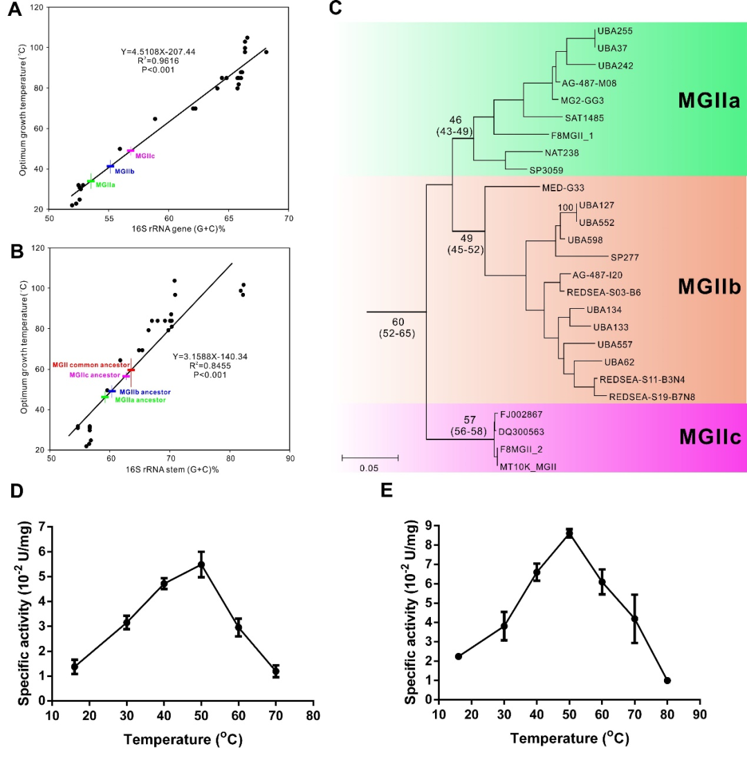 图2. MGIIc的热起源进化证据(A - C)和酶活实验证据(D & E)