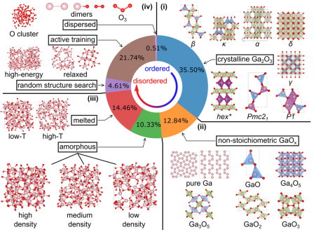图1. 此项研究中自主开发的第二代氧化镓机器学习数据库模型汇总示意图。数据库涵盖(i, ii)所有实验已知的和多种理论预测的氧化镓晶相高精度模型,并普适兼容(iii)非晶/高温熔融态以及(iv)高能/离散态氧化镓体系的数据模型,成功同时满足了高精度和泛用 性分子动力学模拟需求。