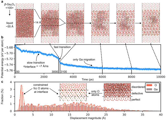 最终公开发布的势函数兼具高精度,泛用性以及高计算效能等优势,可以有效模拟十万至百万原子级体系的氧化镓材料结构演化过程。相应的分子动力学模拟成功揭示了β相氧化镓固液界面重结晶时镓与氧亚晶格相对独立的复杂动态过程(图2)。后续势函数将可被应用于研究高能离子束辐照相变、晶格热输运、表面气态外延生长等氧化镓材料相关重要技术领域。