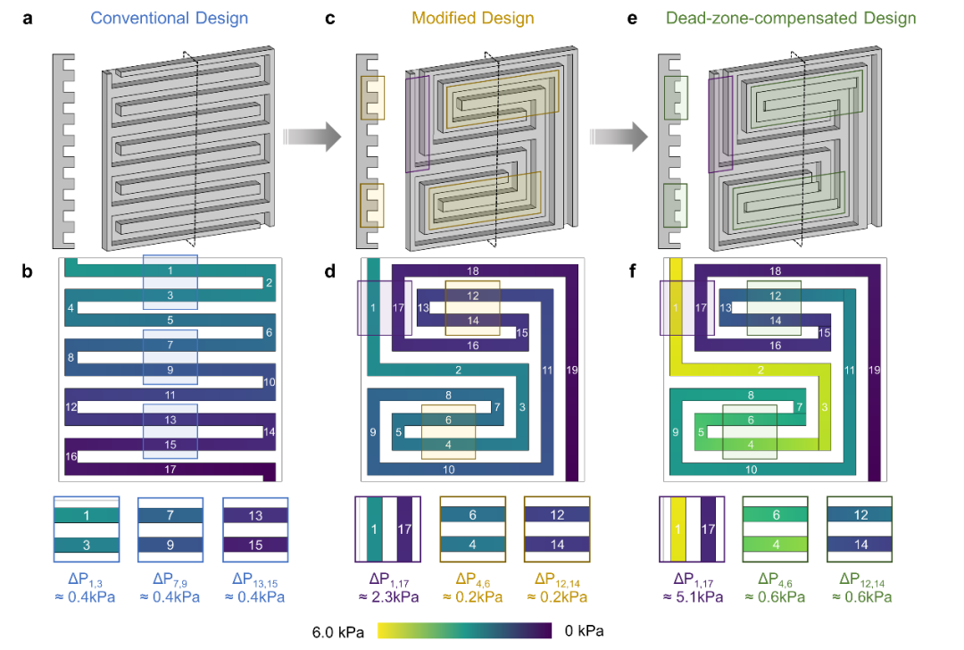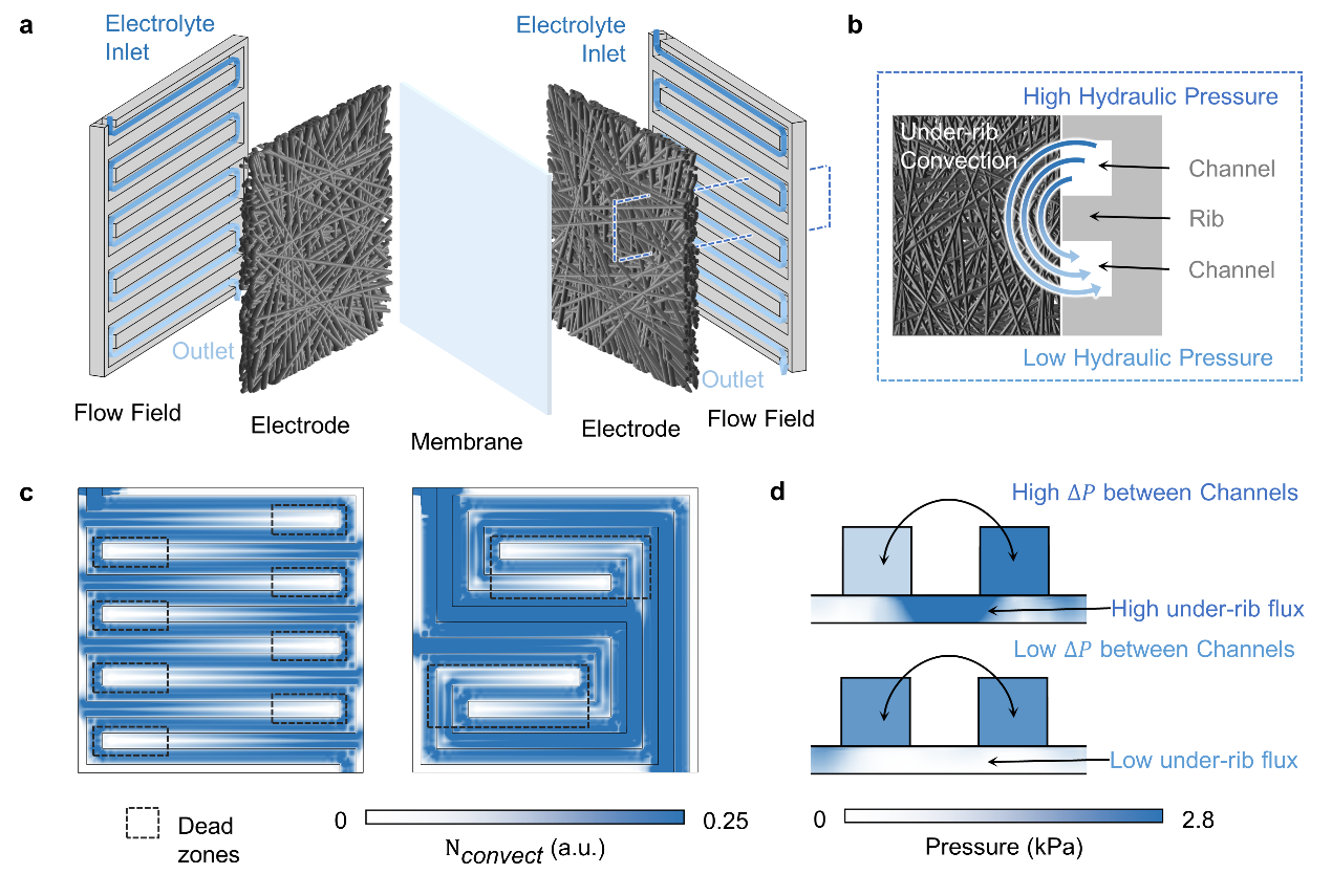 近日,南方科技大学机械与能源工程系赵天寿院士、魏磊副教授在液流电池强化传质方向取得进展,相关论文以“Dead-zone-compensated design as general method of flow field optimization for redox flow batteries”在美国科学院院刊(PNAS)发表。该工作突破了以往流场设计的固有思路,发展针对液流电池传质真空区域检测与调控的新方法,使得液流电池能量效率和额定工作电流密度等关键指标显著提升。