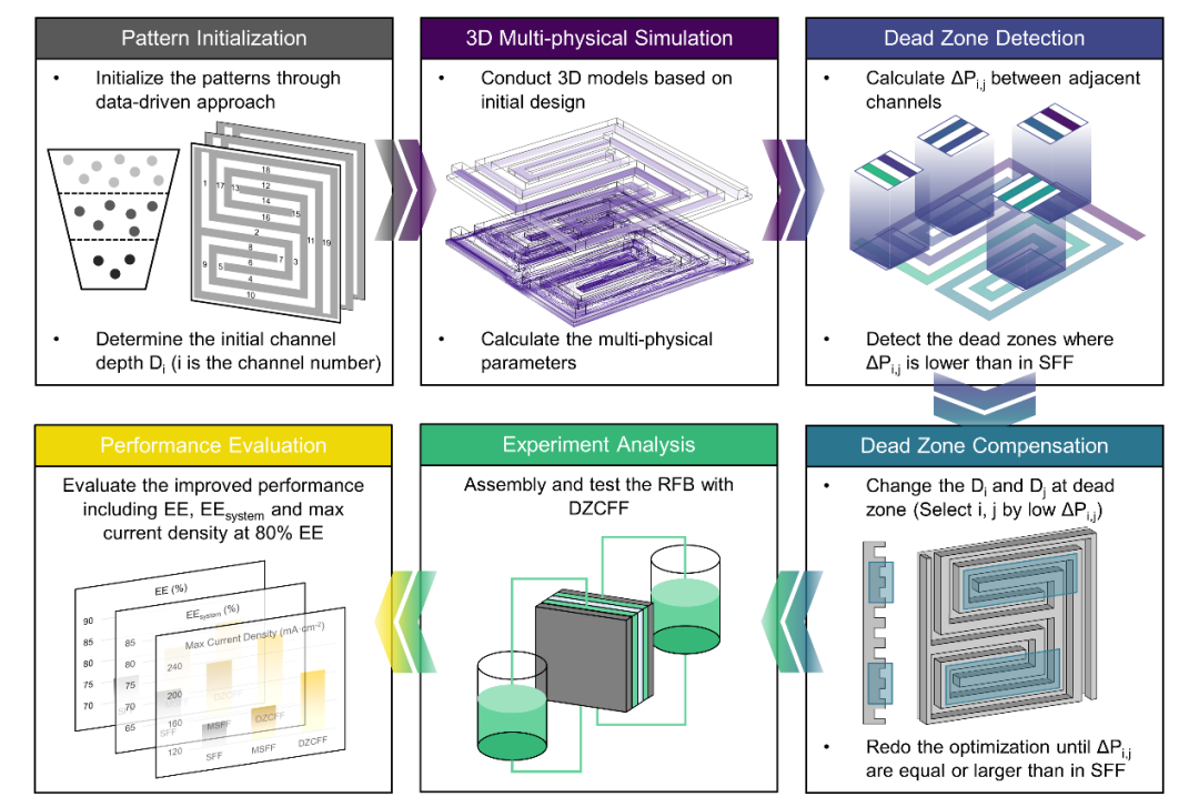 液流电池内部传质真空的现象已经被发现和报道,但由于涉及到多部件、跨尺度和多物理场耦合过程,其形成机理尚未被系统性地分析和讨论。复杂的物质传输和耦合反应的过程使得多孔电极表面活性物质分布难以各处均匀,以活性物质的对流通量作为评价指标时,通常能够发现传质真空区域与液流电池流场结构设计、流道内的水力压力、肋下流强度等具有强关联性(图1)。在明晰液流电池内涉及传质真空区域形成的多部件、多尺度、多物理场耦合过程后,本研究提出了一个用于液流电池的检测与调控的通用性设计方法(图2)。