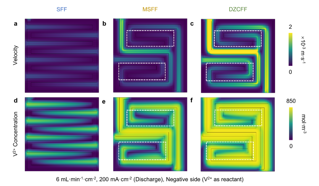 这项工作关注液流电池中普遍存在的传质真空区域的现象,揭示了流场设计与传质真空区域形成原因及影响规律,从多部件、多尺度和多物理场的耦合机理出发,提出了检测与调控的通用方法。将三维多物理场耦合数值仿真模型与实验分析相结合,调控设计对液流电池性能的提升作用得到了全面验证,有极大潜力被应用于大面积液流电池堆设计中。