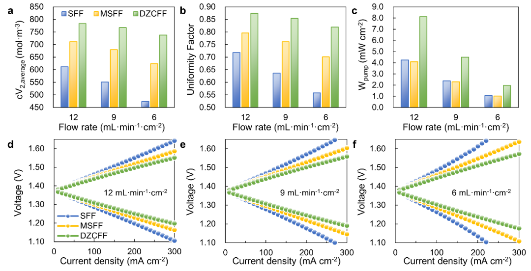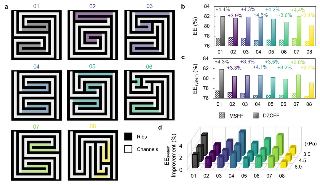 以上结果从理论、仿真和实验等方面充分验证了所提出的所提出方法的有效性。除此之外,该设计方法具有通用性,可以被迁移和应用于其他流场图案中。在相同的电解液流量下,以能量效率和泵功损耗修正的系统能量效率作为评价指标,引入调控设计能够分别实现能量效率3.1~4.6%和2.7~4.3%的提升(图7)。