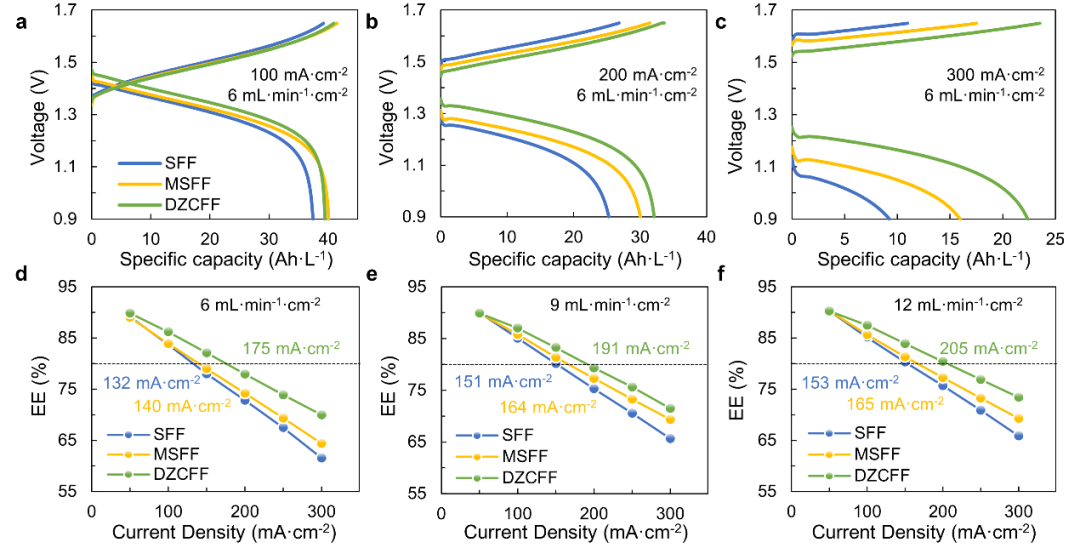 。在此基础上,液流电池的电化学性能可以通过对比多个关键指标进行量化验证。在放电过程中的负极侧,多孔电极中的活性物质平均浓度和分布均匀性系数的提升是传质真空区域得到调控的有力证据(图5)。与此同时,调控设计的流场会一定程度的增加压降从而牺牲一部分的泵功。充放电曲线和能量密度曲线对比了调控前后的电池容量保持率和能量效率,在80%能量效率下的最大工作电流密度达到了205mA cm-2 (图6)。