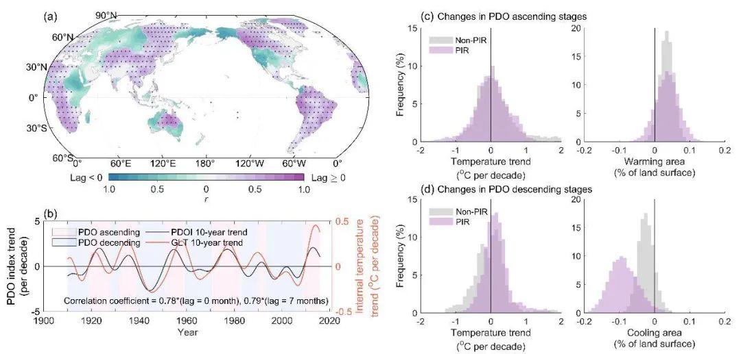 研究采用了自1901年以来的全球陆地温度再分析数据,以量化PDO的影响范围及其对气候变暖速率变化的影响。自20世纪初以来,PDO从负阶段向正阶段转变时,相关地区变暖加速度一直相当高,变暖的地区不断扩大。与此同时,PDO从正阶段向负阶段转变时所带来的降温效果(抵消人为变暖)正在全球范围内缩小。这种变化意味着,PDO的下一次从负相位向正相位转变将会带来一段全球迅速变暖时期。