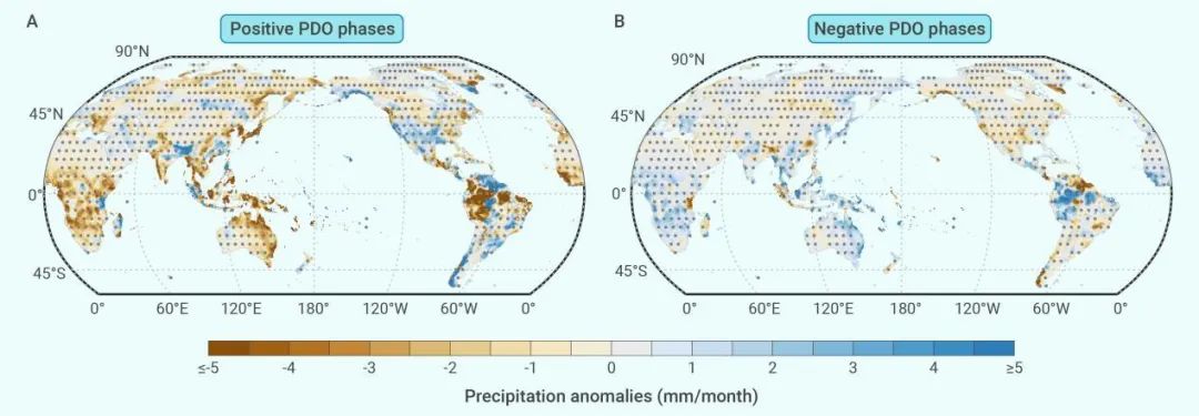 图3. 太平洋年代际涛动处于正负相位时对陆地降水影响的空间异质性,且引起的降水异常变化幅度不同