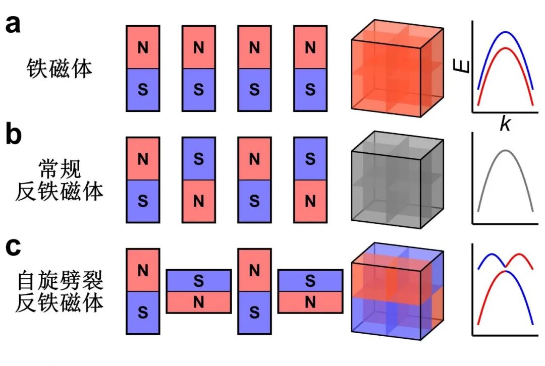 固体材料的磁性来源于构成晶格的原子的磁矩的有序排布,带有磁矩的磁性原子可以被看作一个具有南北极的微小磁铁。铁磁体 (ferromagnet) 具有宏观磁性,是晶体中所有磁性原子的磁矩都沿同一方向排列造成的(图1a)。反铁磁体 (antiferromagnet) 没有宏观磁性,则是晶体中磁性原子的磁矩沿着相反的方向规律排布造成的(可以是由图1b所示的“上下上下”,也可以是“上上下下”),这使得材料的总磁矩为零。