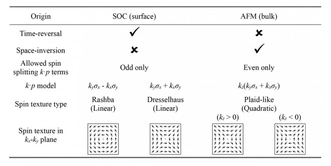 图3 MnTe2中表面自旋轨道耦合引起的自旋劈裂和体态反铁磁序引起的自旋劈裂的比较,包括对称性、k·p模型和允许的面内自旋纹理类型