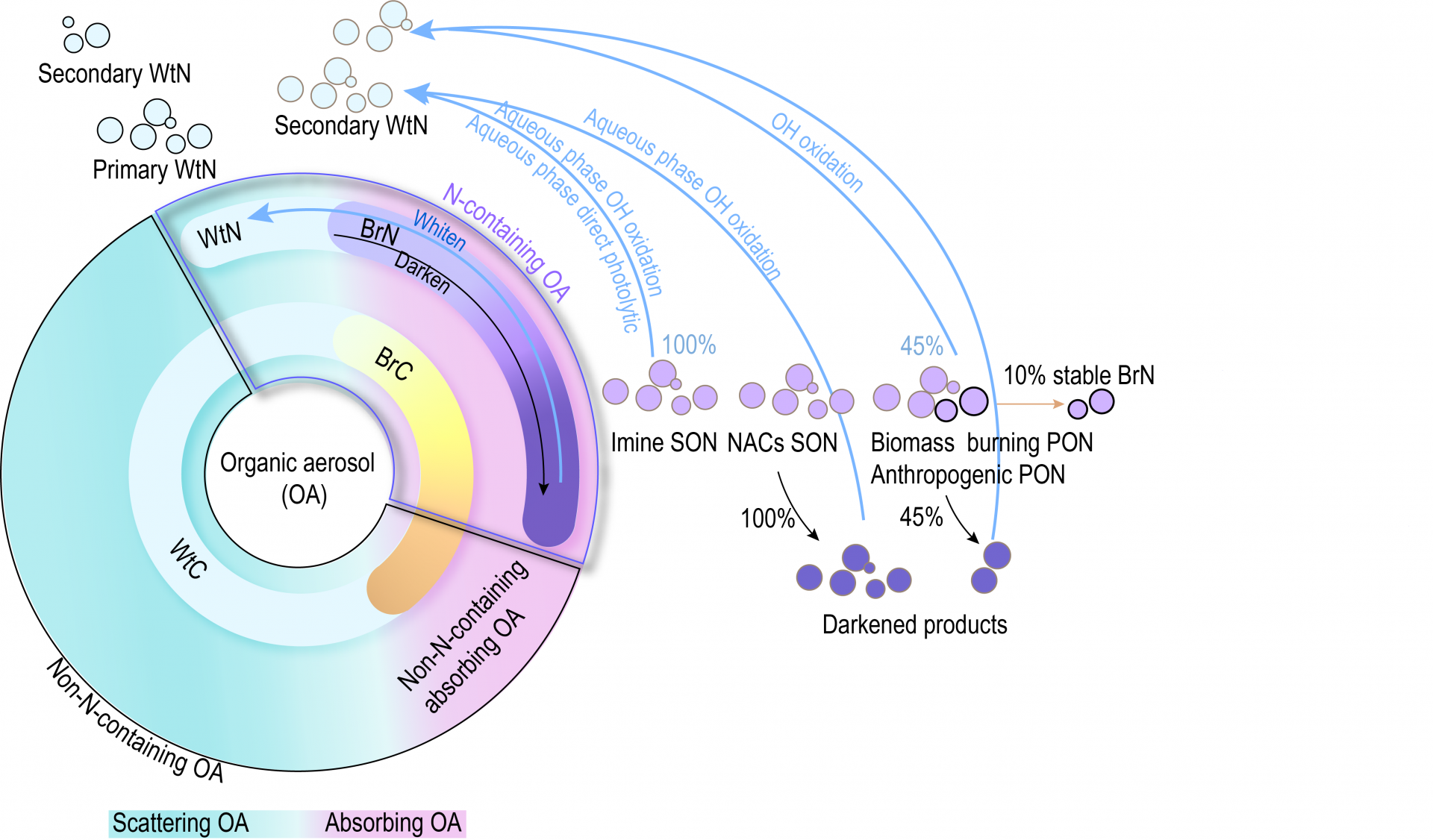 图1. 有机气溶胶中含氮组分及其吸光性变化的示意图