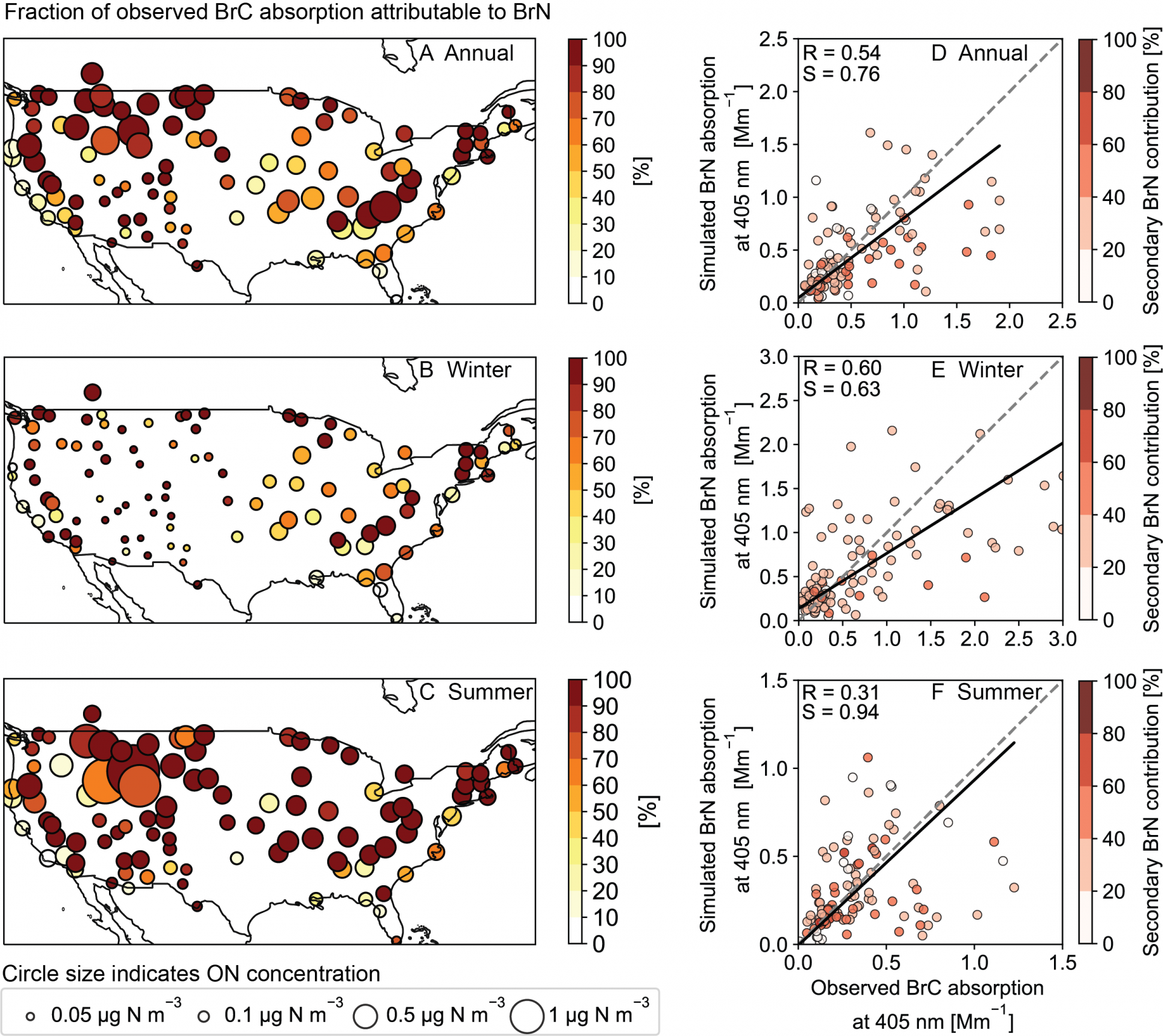 研究显示,模式模拟的棕色氮吸收系数可解释北美观测到的地面大气有机气溶胶吸收系数的76%(图2)。此外,棕色氮再现了有机气溶胶吸光性的空间分布和季节变化特征。冬季,模拟的棕色氮吸收系数占观测有机气溶胶吸收的63%;夏季,这一比例上升至94%。有机气溶胶吸光的时空变化,主要反映了不同来源有机氮组分在质量吸收效率(mass absorption efficiency,MAE)和光漂白敏感性的差异。