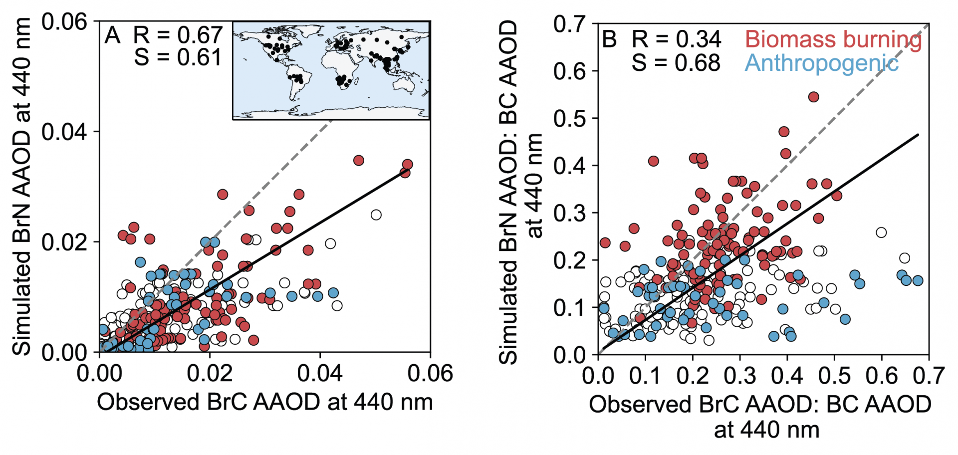 图3. 全球范围内模拟的棕色氮吸收性气溶胶光学厚度(AAOD)与AERONET观测有机气溶胶吸收性气溶胶光学厚度的月均值对比。
