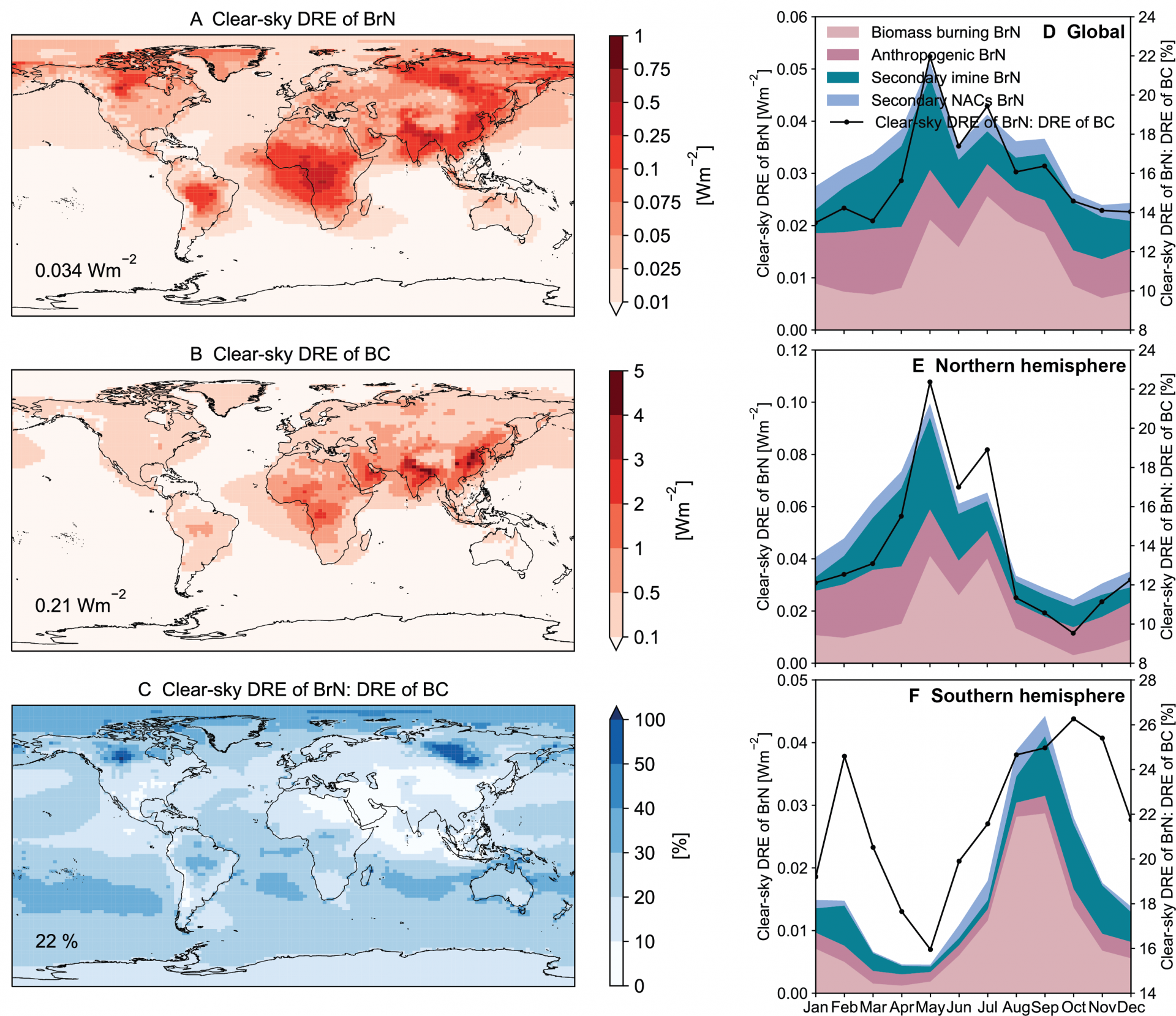 图4. 模拟全球晴空条件下棕色氮气溶胶吸收性直接辐射效应(DRE)与其来源归因,及其与黑碳气溶胶辐射效应比值