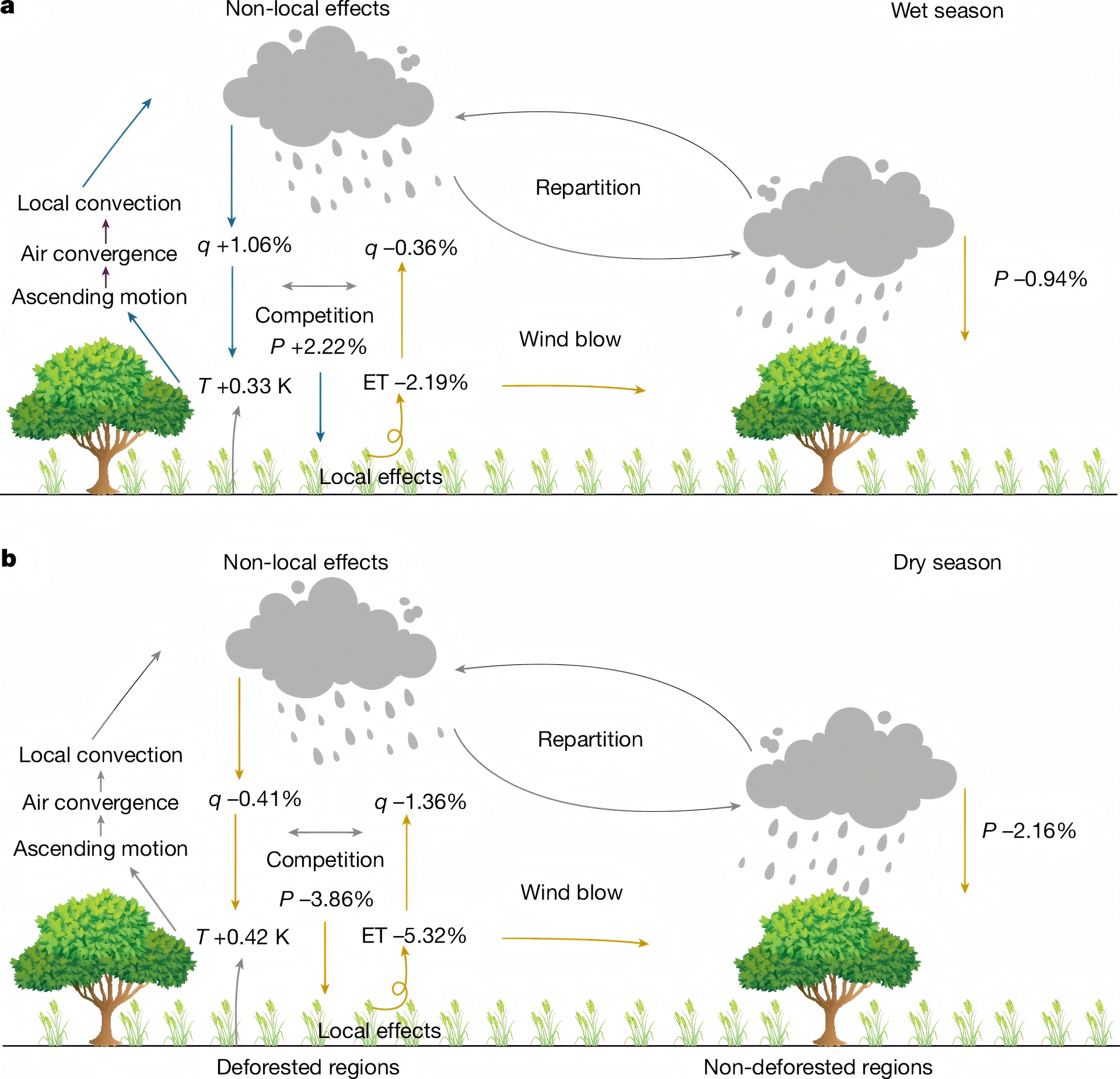 为了攻克这一关键科学问题,研究团队展开了深入研究。他们通过对区域气候模型的改进和耦合先进的水汽追踪模块,首次阐释了亚马孙毁林-降水关系尺度效应的驱动机制和背后的季节性影响(图1)。这一发现从水汽来源的角度,系统性解释了局地和非局地水汽对调控毁林-降水关系的重要机制,二者的相互作用也形成了明显的干湿季差异(图2),重塑了学界对毁林-降水关系的认知,对热带区域的森林保护和气候认识具有深远影响。