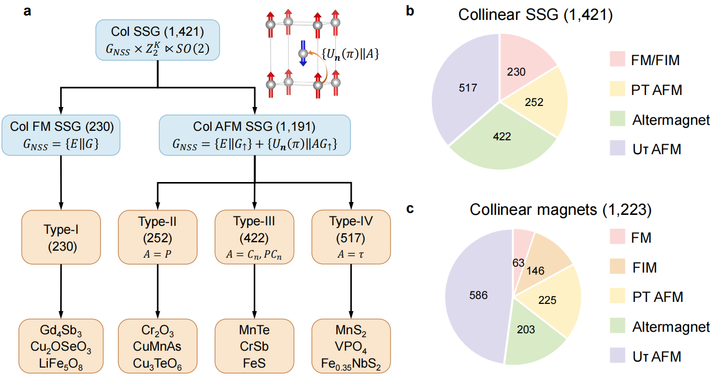 (1)230个描述单种磁子格的I型共线自旋空间群,对应共线铁磁体以及存在对称性无法联系的多个磁子格的共线亚铁磁体(包括补偿亚铁磁体)。