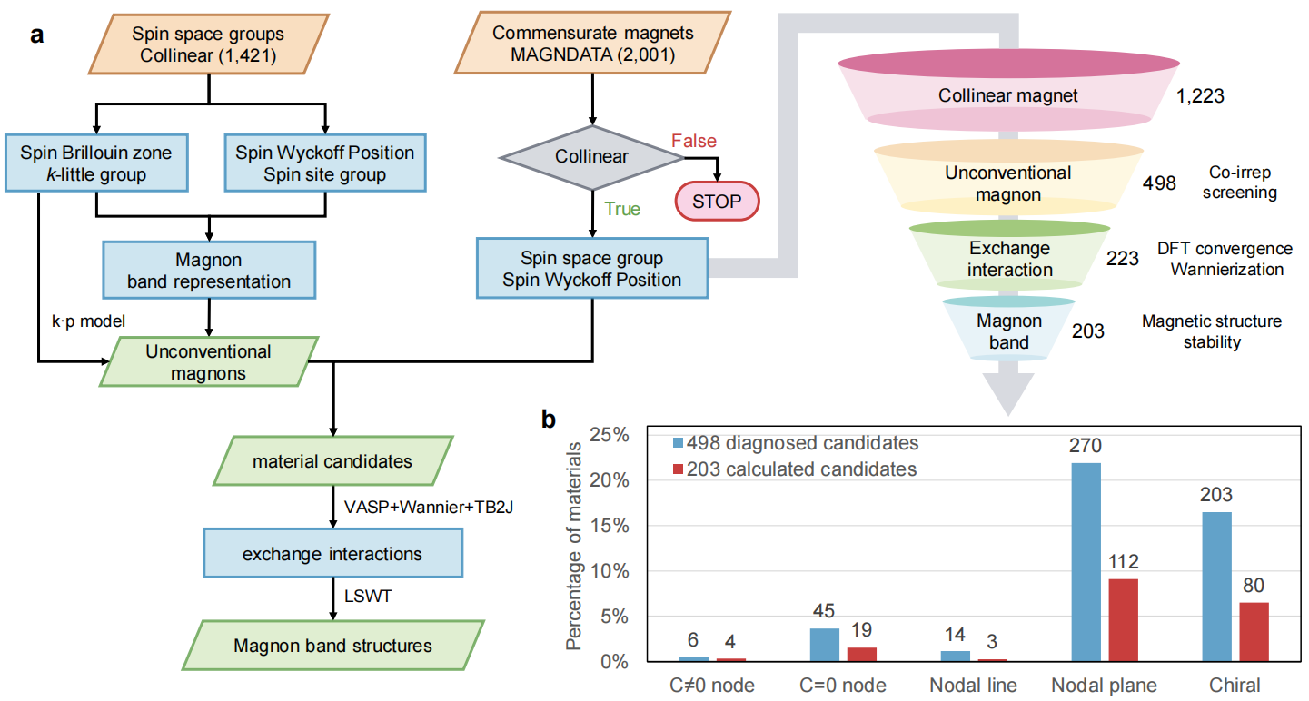 近日,南方科技大学物理系教授刘奇航课题组在共线自旋群理论及共线磁体中非常规磁振子的完整分类研究中取得进展,相关成果以“Unconventional magnons in collinear magnets dictated by spin space groups”为题发表在学术期刊《自然》(Nature)上。