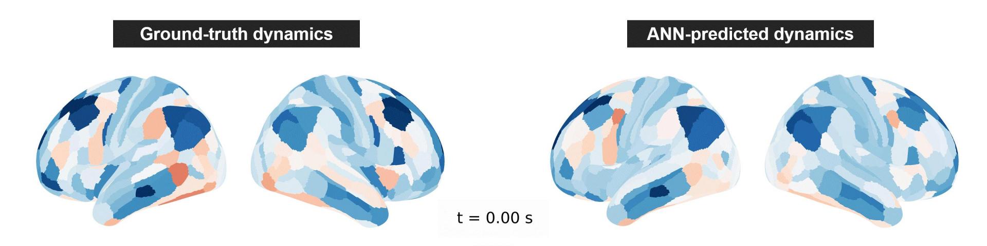 脑功能成像和电生理记录能够提供多个脑区的活动记录,但这些脑区在信息处理过程中是如何交互的仍不清楚(图 1a)。团队研究人员训练了一个ANN,使其能根据前面三个时间点的状态预测下一个时间点的脑活动,训练目标是最小化单步预测误差(图 1b)。为了验证该ANN是否能够捕捉脑区之间的交互关系,研究人员将其预测输出递归地反馈回模型,以产生模型生成的神经信号(图 1e)。本文使用人类静息态功能磁共振成像(rs-fMRI)数据,将由模型生成的信号计算得到的功能连接(model FC)与真实rs-fMRI数据计算得到的功能连接(empirical FC)进行比较,两者表现出极高的相关性,表明ANN有效捕捉了脑区间的功能依赖关系(图 1f)。这表明,训练后的ANN可作为可靠的数字孪生脑,用于虚拟扰动。