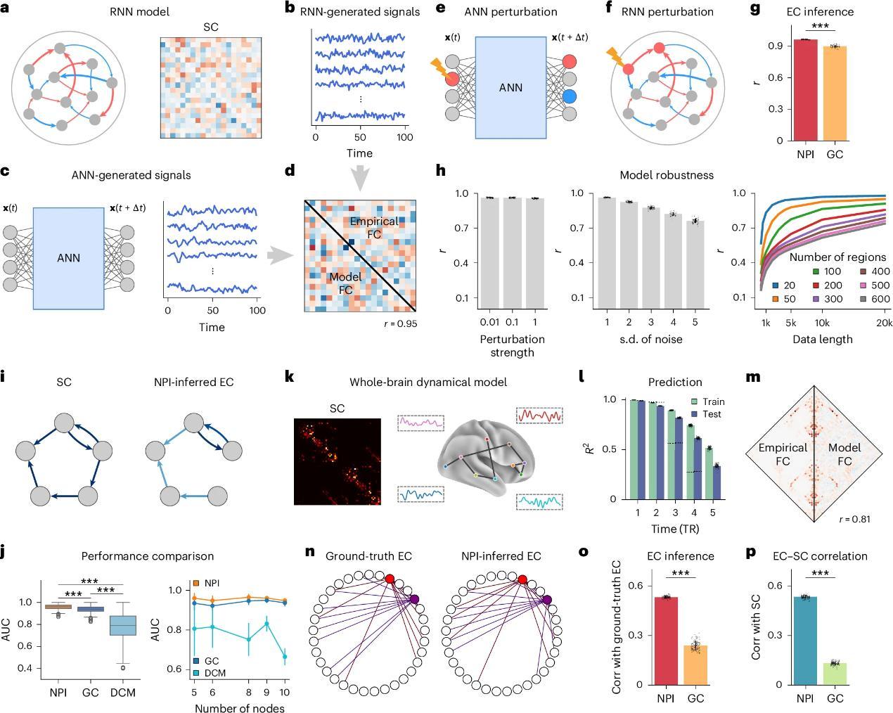 团队使用已知真实有效连接(ground-truth EC)的生成模型对NPI的性能进行了测试。研究人员使用了三个模拟数据集:一个由循环神经网络(RNN)模型生成(图 2a–h),另外两个来自fMRI的生成模型(图 2i–p)。ground-truth EC是通过将“扰动-记录”范式直接应用于生成模型上获得的。本文将NPI推断的EC和ground-truth EC进行比较以评估其性能。