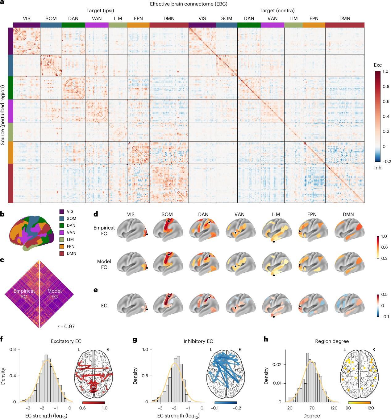 通过分析EBC,研究人员发现,兴奋性和抑制性EC的强度分别服从对数正态分布(图 3f-g)。最强的兴奋性连接主要分布在功能网络内部,而最强的抑制性连接则更多出现在跨网络和跨半球之间(图 3f-g)。为了分析每个节点在网络中的重要程度,本文二值化了EBC矩阵并计算了每个节点的度,发现与其他区域联系紧密的脑区广泛分布于多个功能网络,显示出高中心性区域的广泛分布(图 3h)。