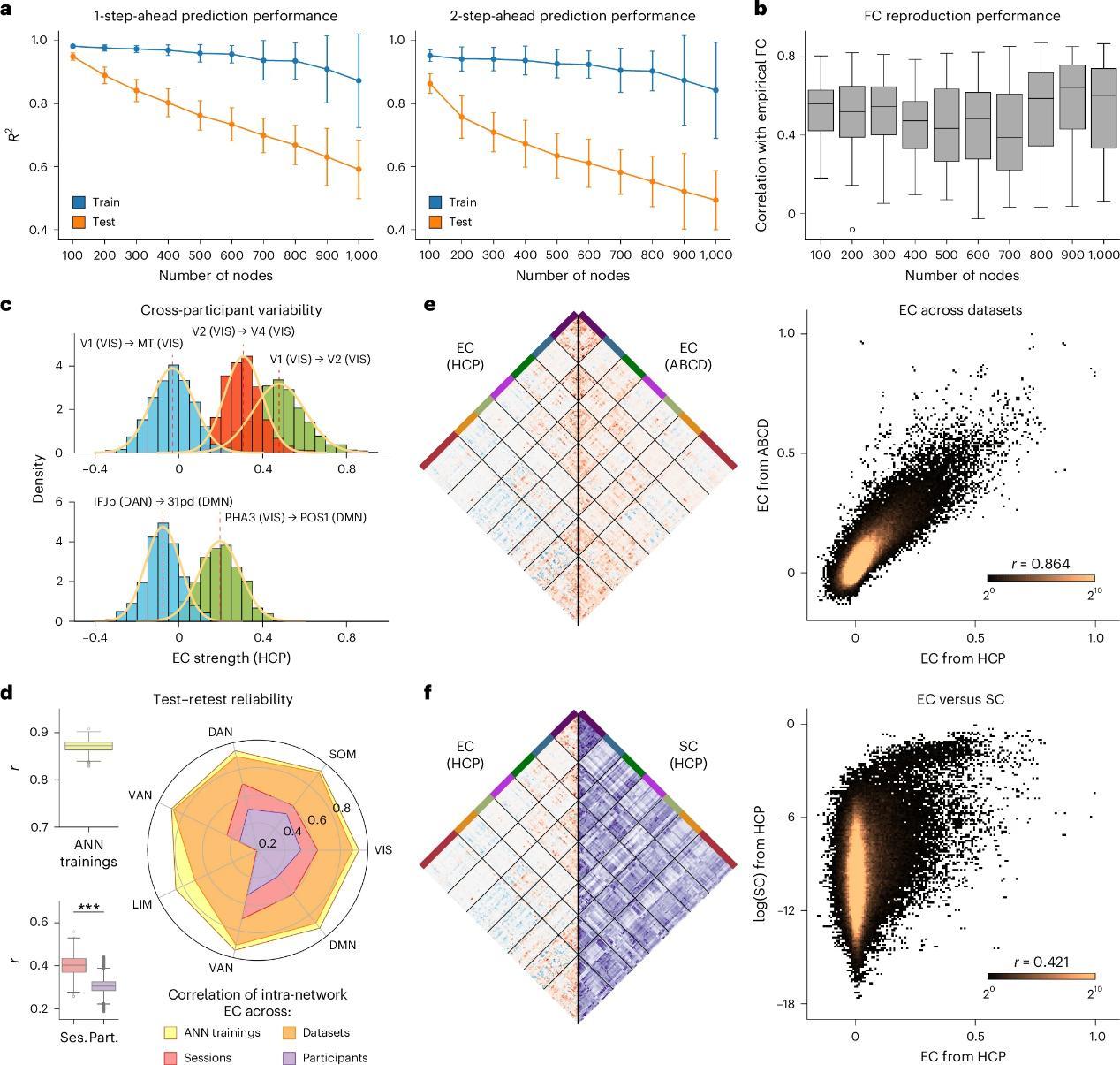 之后,研究人员对ANN中每个节点进行扰动,每个节点代表一个特定的脑区(图 1c)。扰动通过在选定节点的输入数据上施加脉冲信号实现(图 1g)。通过比较目标区域在扰动输入与基线输入下输出结果的差异,可以推断从源区域(被扰动区域)到目标区域的EC。如果目标区域活动增强,则表示存在兴奋性EC;若活动减弱,则表示为抑制性EC(图 1h)。通过对所有节点依次施加扰动,可以刻画全脑任意两个脑区之间的EC连接(图 1d)。