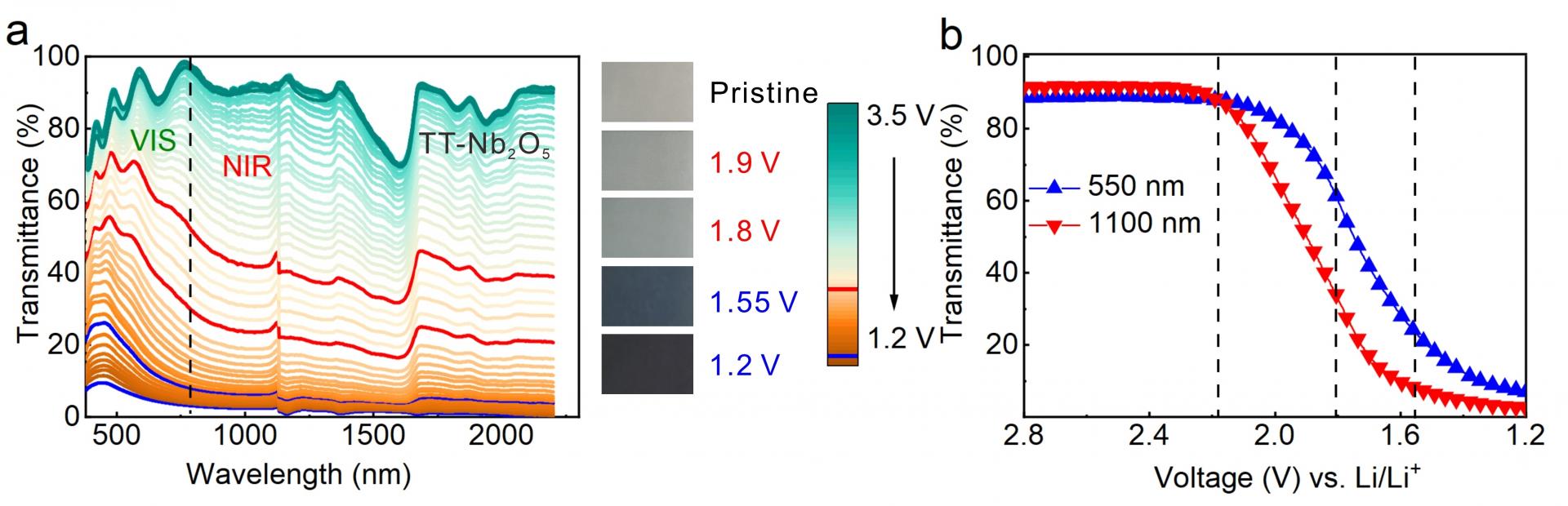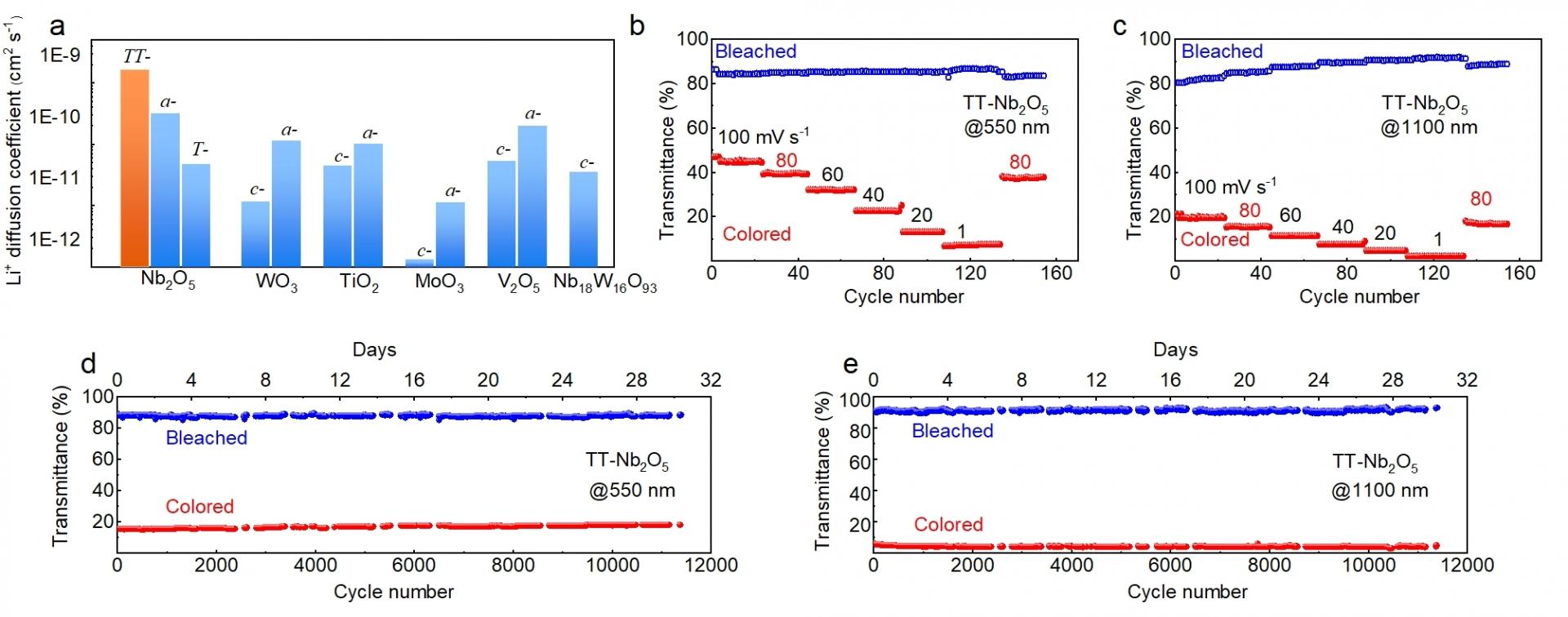 本文中的 TT-Nb2O5 就像电致变色材料界的 “六边形战士”,为解决上述这些难题提供了思路。该材料可实现可见光与近红外光的独立调控,提供明亮模式(高透光)、冷模式(阻隔红外)和暗态模式(全阻隔)三种工作状态。它具有超快响应速度:得益于其独特的二维层状结构,开关动力学性能优异。TT-Nb2O5 的二维层状结构由致密和疏松的原子层交替排列构成,形成了易于离子快速传输的低阻力通道。同时,TT-Nb2O5 晶体结构中非等效的离子有效结合位点为双波段调控提供了可能。此外,晶体结构中沿b轴空的传输通道以及较大的层间距促就了离子注入/抽出过程中无体积膨胀、无相变、从而超过104次循环后并未观察到光调制的退化。