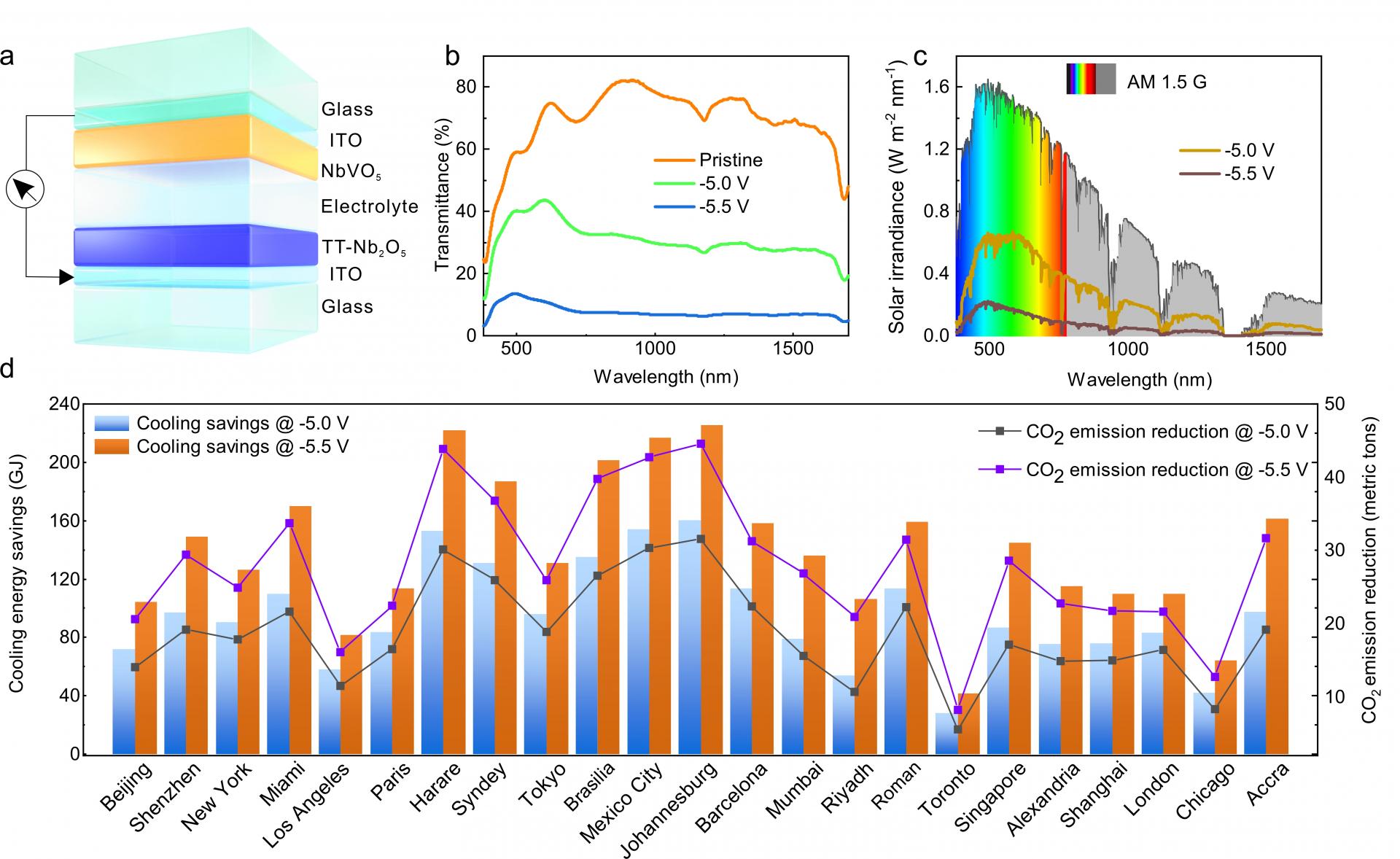 科研团队构筑的基于 TT-Nb2O5 制备的智能窗原型器件展现出优异的节能潜力:在不影响可见光透过率的“冷模式”下,可实现160 GJ的“制冷”节能。在全阻隔的“暗态模式”下,节能效果高达225 GJ。模拟计算表明,该技术在炎热气候地区的中型办公楼应用中,可为暖通空调系统带来显著的节能效益。