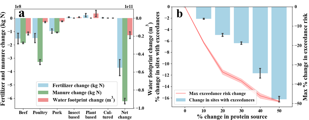 图1. 蛋白质来源转变对(a)氮肥、粪肥、水足迹和(b)地下水硝酸盐的影响