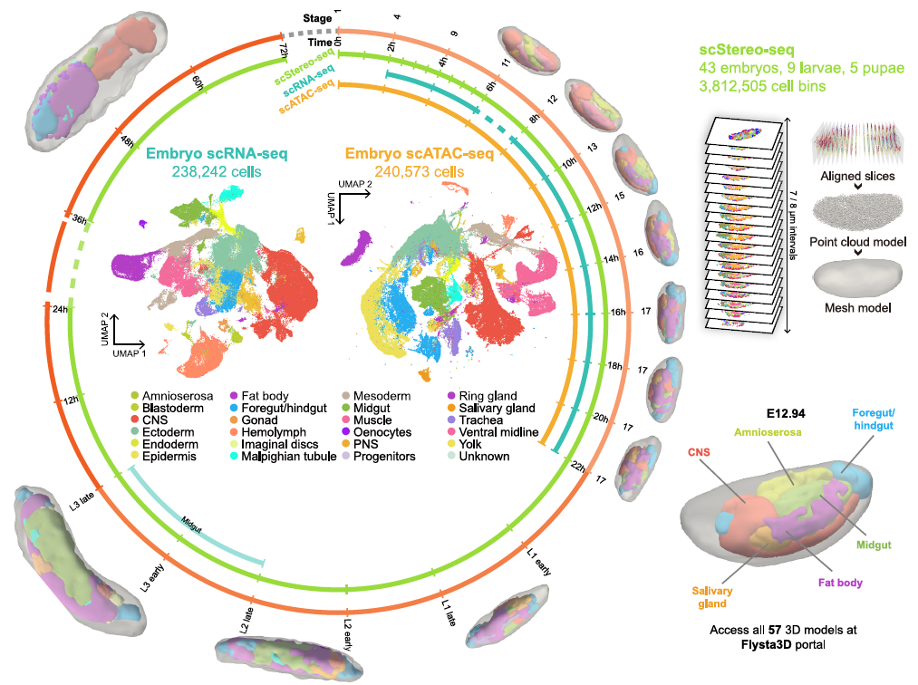 图1.果蝇发育的单细胞三维时空多组学图谱