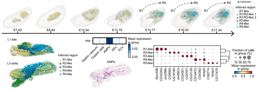 研究人员以果蝇的胚胎中肠为模型,不仅鉴定了多种功能特异的细胞类型与亚类,详细刻画了其分化轨迹与空间分布动态,还对其在幼虫和蛹阶段的动态变化进行了深入分析。通过子聚类分析,研究人员在幼虫和蛹的 Stereo-seq 样本中识别出中肠细胞类型,并发现与胚胎相比,幼虫中肠在大小和细胞类型多样性方面都有显著增加。从胚胎到幼虫,中肠的细胞类型与调控关系与成虫都存在相似性,揭示了成虫功能性细胞早期形成过程的调控关系(图3)。